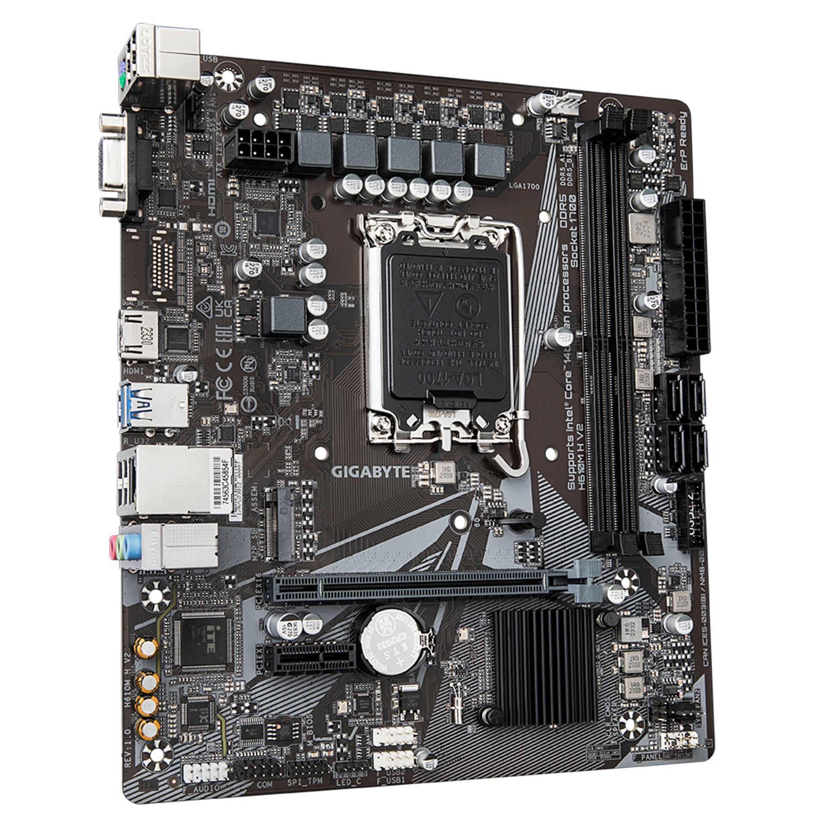 مادربرد «H610M H V2 DDR4 rev. 1.0» محصولی از شرکت «گیگابایت» است، که از فرم فاکتور microATX بهره میبرد. سوکت پردازندهی ارائه شده برای این محصول Intel LGA 1700 با چیپست Intel H610 است. شرکت گیگابایت این محصول را به دو اسلات حافظه تجهیز کرده که میتوان به یاری آنها میزان حافظهی کامپیوتر را تا 64 گیگابایت ارائه کرده است. فرکانس پشتیبانی شده توسط این مادربرد برابر با 2133 مگاهرتز است. مادربرد H610M H V2 DDR4 rev. 1.0 از یک اسلات PCI Express x16 پشتیبانی میکند. در پنل پشتی این مادربرد شرکت گیگابایت یک پورت PS/2 برای اتصال ماوس/ کیبورد تعبیه شده که برای اتصال ماوس و کیبوردهای قدیمی مناسب است. درقسمت درگاههای این مادربرد دو پورت USB 3.2 Gen 1 و 4 پورت USB2.0 برای اتصال تجهیزات مانند فلشمموری، هارددیسک به چشم میخورد. وجود درگاه USB 3.2 Gen 1 در این محصول باعث شده که بتوان اطلاعات را با سرعت زیاد انتقال داد. مادربردهای پشتیبانی کننده از چیپست H610 برای استفاده در مصارف عمومی و مالتی مدیا مناسب هستند.