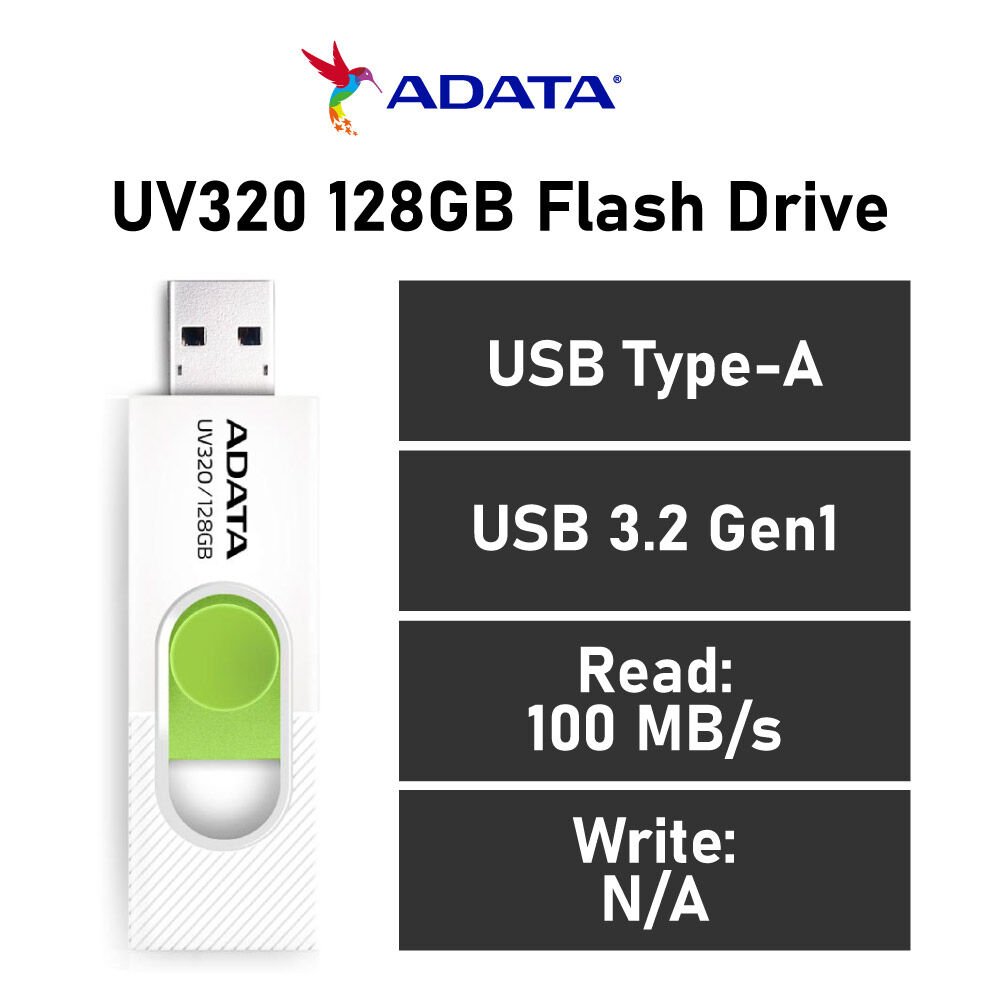 مدل «UV320» از سری محصولات فلش میموری شرکت «ای دیتا» (ADATA) است که در ظرفیتهای 8 تا 64 گیگابایتی و در رنگهای مختلف عرضه میشود. این فلش میموری از حافظه 128 گیگابایتی بهرهمند است؛ با این مقدار ظرفیت، حجم بسیار زیادی از اطلاعات؛ از قبیل موسیقی، فیلم و … را میتوانید همیشه در کنار خود داشته باشید . در راستای طراحی جمعوجور، شرکت ای دیتا بر روی UV320 یک کلید تعبیه کرده است که با فشار دادن آن به جلو، درگاه USB به بیرون هدایت میشود و برای برگرداندن آن به داخل، بایستی کلید را به عقب بکشید. درگاه USB این حافظه فلش USB 3.1 است و از سرعت استاندارد انتقال اطلاعات 10 گیگابیت بر ثانیه برخوردار است. این فلش میموری با بیشتر دستگاههای الکترونیکی اعم از لپ تاپ، کامپیوتر، تلفن هوشمند، تلویزیون هوشمند، سیستم صوتی خودرو و … سازگاری دارد. حافظه فلش UV320 در برابر آب، گردوغبار و ضربه مقاوم نیست؛ بنابراین هنگام استفاده، مواظب صدمات احتمالی باشید
