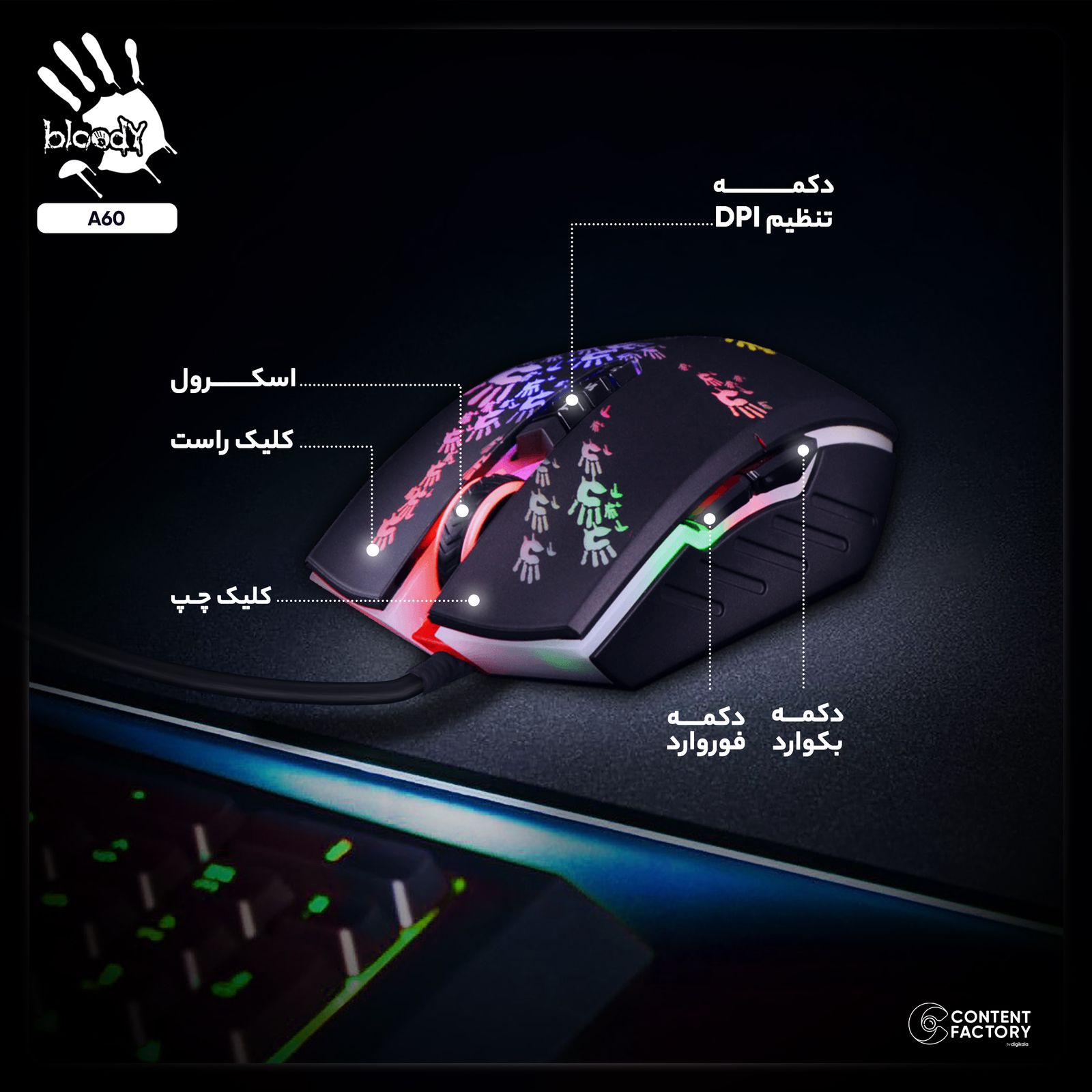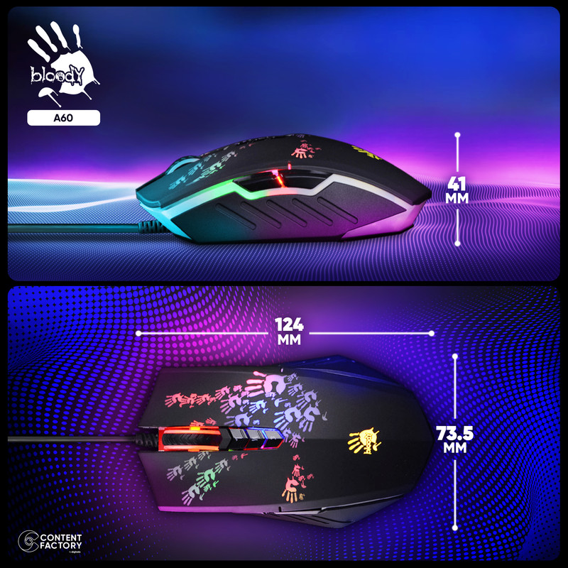 ماوس مخصوص بازی بلادی مدل A60 یکی از ماوسهای محبوب گیمرهای حرفهای به شمار میآید. برند bloody زیرمجموعه شرکت خوشنام A4tech تایوانی است که تجهیزات جانبی کامپیوتر تولید میکند. این ماوس در دسته ماوسهای با سیم قرار میگیرد و از طریق دو نوع پورت USB و PS/2 میتواند به دستگاه وصل شود و طول کابل آن به یک متر و 80 سانتیمتر میرسد. طراحی متقارن ماوس مذکور این امکان را برای تمامی افراد راست دست و چپ دست فراهم کرده است که از آن استفاده کنند. حسگری که در این ماوس به کار رفته است در دسته حسگرهای مادون قرمز LED (اینفرارد) قرار میگیرد. یکی از شاخصترین ویژگیهای این ماوس زمان پاسخدهی بسیار کوتاه آن است که به 0.2 میلیثانیه میرسد. محدوده دقت ماوس مذکور از 3200 DPI بیشتر است و میزان دقت این ماوس در بازهای بین 800 تا 4000 DPI قرار میگیرد. طراحان شرکت A4tech برای ماوس A60 پنج حالت وضوح پیشفرض قابل تنظیم 1000، 1200، 1600، 2000 و 6200 DPI در نظر گرفتهاند. این ماوس با تمام سیستمعاملهای موجود در بازار از جمله ویندوز و مک سازگار است و یک حافظه داخلی با ظرفیت 160 کیلوبایت دارد. این ماوس گیمینگ دارای 8 دکمه قابل تنظیم است که فرد بر اساس تمایل خود میتواند از طریق نرمافزار آن را شخصی سازی کند. ماوس A60 یکی از سریعترین ماوسهای گیمینگ به حساب میآید و میتواند گزینه مناسبی برای یک گیمر حرفهای باشد.